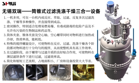 无锡市双瑞机械有限公司是一家专业从事过滤洗涤干燥设备研发、制造和销售的企业。公司拥有多年的行业经验和雄厚的技术实力, 在结晶过滤、洗涤干燥等领域积累了丰富的经验。双瑞机械始终坚持技术创新,不断提升产品性能,为客户提供优质的解决方案。
