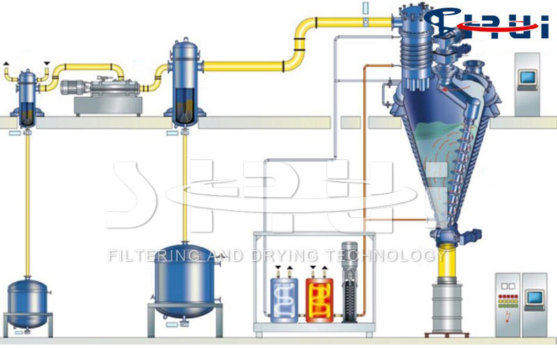 (6) 单锥干燥机出料直接连接到粉碎机或全封闭的粉体输送设备,更能保证整套工艺过程完全在全封闭的环境下完成。