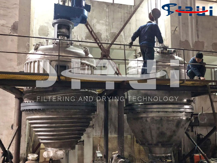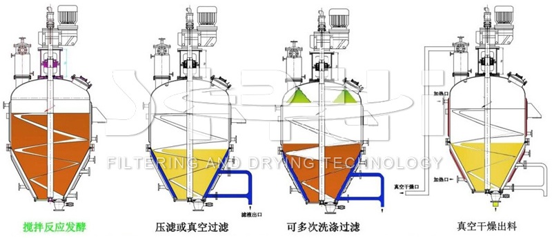 筒锥式反应过滤干燥三合一是在同一密闭空间内,通过夹套控制温度而进行物料的加压或真空反应。反应结束,对物料加热真空浓缩后,降温结晶析出反应产物;启动搅拌主轴,使下锥体过滤板对结晶后的固液混合物进行加压或真空处理,利用滤饼两端的压差以及搅拌螺带压榨的挤压作用进行固液分离;通入洗涤液,使滤饼中的反应液进一步脱出并清除杂质,固液分离过程结束可得到较干的固相物;启动内加热螺带,对物料加温真空干燥zui终得到达到一定干度的产品。