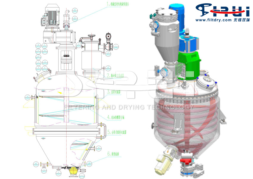(2) 压滤或真空过滤:当反应完后,通过压滤或真空吸滤、过滤滤液,在过滤阶段,由于螺带与过滤介质的良好贴合刮壁作用,可使物料在薄层滤饼条件下进行过滤,过滤效率高;