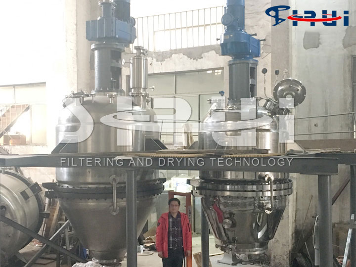 (1) 搅拌反应:本机为筒锥式结构,可在本机内对物料进行加热或冷却的恒温定时反应;蒸馏冷却后得到的产品中加入纯水和稳定剂,加热至75℃~95℃融化,然后边搅拌边缓慢降温至30℃~50℃(2) 压滤或真空过滤:当反应完后,通过压滤或真空吸滤、过滤滤液,在过滤阶段,由于螺带与过滤介质的良好贴合刮壁作用,可使物料在薄层滤饼条件下进行过滤,过滤效率高;