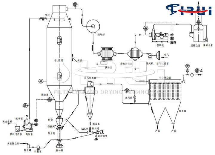 将溶液、乳浊液、悬浊液或浆料在热风中喷雾成细小的液滴,在它下浮过程中,水分被蒸发而成为粉末状或颗粒状的产品。在干燥塔顶部导入热风,同时将料液用高压泵送至塔顶,经过雾化器喷成雾状的液滴,液滴与高温热风接触后水分迅速蒸发,在极短的时间内便成为干燥产品,从干燥塔底部排出。热风与液滴接触后温度显著降低,湿度增大,作为废气由排风机抽出,废气中夹带的微粉用分离装置回收。