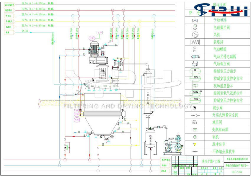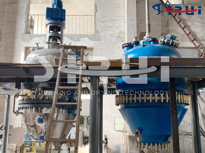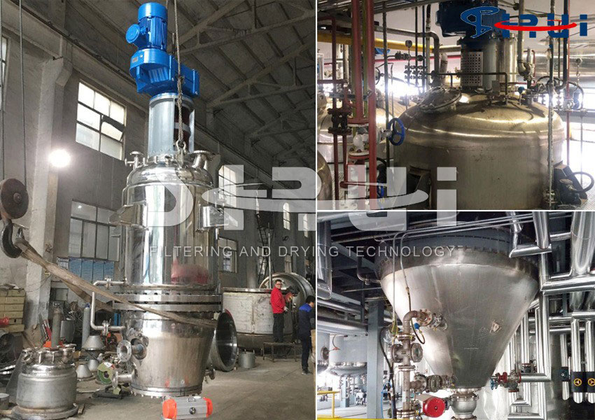 在反应阶段,反应物料从顶部加入,独特的搅拌结构可使物料在机内得到均匀的搅拌,并通过筒体夹套、锥体夹套及空心轴、空心螺旋叶的同时加热或冷却,使物料在机内充分反应。在过滤阶段,本机可使物料在机内通过加压或抽真空过滤滤干,并加入洗涤液,使物料在机内进行多次自动再浆洗涤,达到洗涤要求后再压干。在干燥阶段,筒体夹套、锥体夹套、空心轴、空心螺带同时对物料进行加热并在顶部抽真空,对物料进行真空密闭低温干燥,干燥后自动密闭出料。