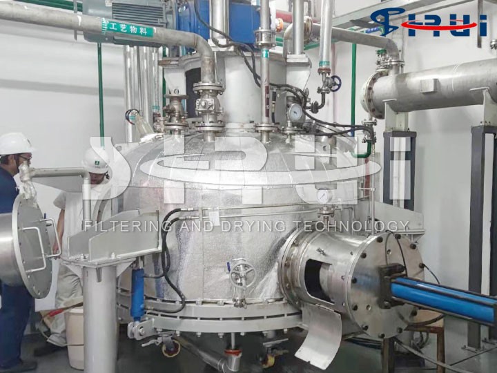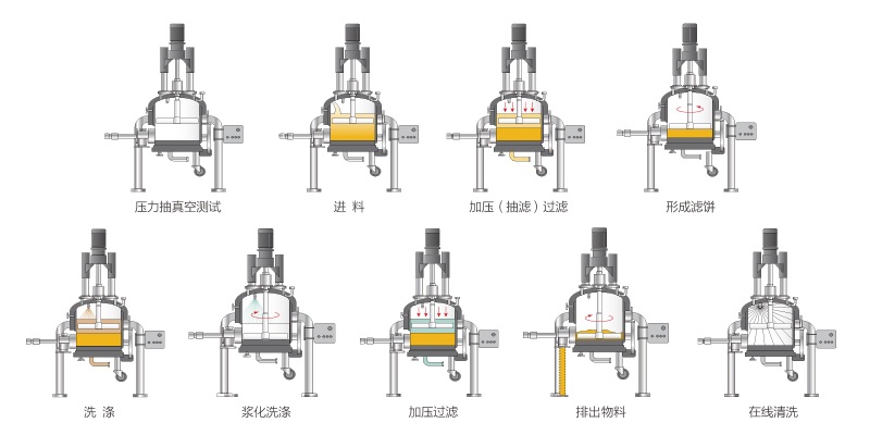 将上游反应釜或结晶设备产生的固液混合物晶浆放料到三合一设备罐体内,以压力差为推动力实现固液混合物的过滤分离。实际应用中有加压压滤、真空抽滤以及加压抽真空组合形式过滤等。加压压滤采用洁净的压缩空气、氮气或其他惰性气体,具体应根据固液混合物的特性选择压缩气体。例如固液混合物易被氧化或固液混合物中有易爆介质,就不能采用压缩空气,而应选用惰性气体。根据实际经验,制药行业一般产品压滤压力0.2~0.3MPa即可实现过滤,化工或食品行业一些产品需要较高的过滤压力,有的压力达到1.0MPa。
