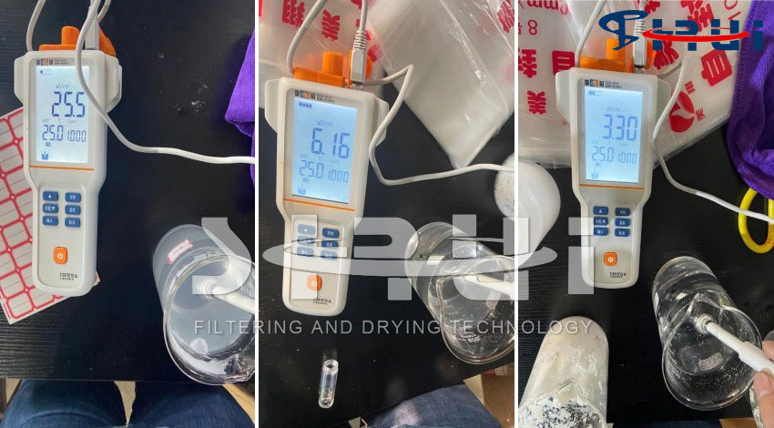 将酸碱洗涤液通入过滤洗涤一体机中,对滤饼进行重新搅拌混悬,使树脂粉料可以得到非常彻底的洗涤,被包裹的无机盐及其它组分会被释放出来。再浆搅拌均匀再把物料压干。若洗涤一次不够,可进行多次洗涤,这时重复上述步骤多次即可,操作方便,劳动强度极低。