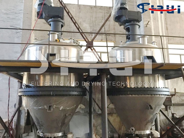 目前精细化工行业中广泛应用的过滤洗涤二合一装置,由于其内部都是采用平板式烧结网过滤,通过内部搅拌器的升降和旋转的双重作用,将内部固体残留物排出机外,但常规的装置不仅过滤效果不佳、还极易出现滤液渗漏,且使用者的洗涤的麻烦,并不利于使用者进行多次操作。而且常规的过滤洗涤二合一往往无法快速的将滤液排出,且还不便于操作者对装置清理完全,还容易出现滤液渗漏浪费的情况。无锡双瑞研发的高效筒锥式过滤洗涤二合一,顶盖、筒体及锥球型壳体通过法兰相互连接形成封闭的容器,搅拌驱动装置带动中心轴及环绕中心轴的螺旋搅拌装置进行旋转,带动物料实现搅拌作业;在容器外侧壁的过滤装置能够对物料进行过滤,滤液穿过过滤装置被滤液收集板收集,并通过滤液出口排出筒体。容器底部的锥球型壳体配合与锥球型壳体的球面结构内表面贴合的底搅拌装置,可使得容器内的物料不存在操作死角,使得搅拌更均匀,且不会造成物料的浪费。