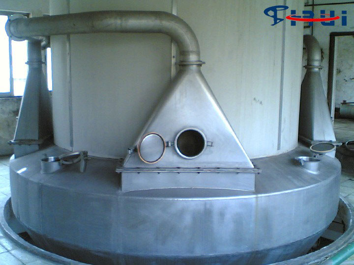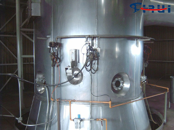 将溶液、乳浊液、悬浊液或浆料在热风中喷雾成细小的液滴,在它下浮过程中,水分被蒸发而成为粉末状或颗粒状的产品。在干燥塔顶部导入热风,同时将料液用高压泵送至塔顶,经过雾化器喷成雾状的液滴,液滴与高温热风接触后水分迅速蒸发,在极短的时间内便成为干燥产品,从干燥塔底部排出。热风与液滴接触后温度显著降低,湿度增大,作为废气由排风机抽出,废气中夹带的微粉用分离装置回收。