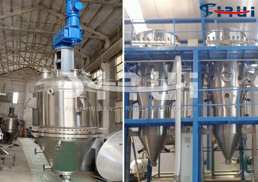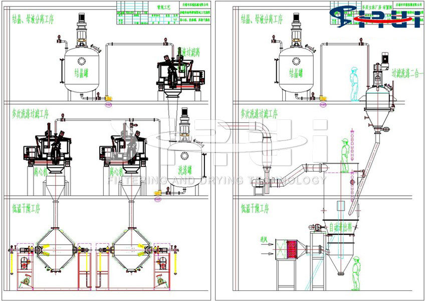 原料药、农药、染料及其它精细化工生产过程的后处理工序中,一般要有结晶釜、过滤机、干燥机等设备来完成。这些设备单独运作,都有各自的配套装置,占地面积大,造价贵,单元与单元间物料的搬运或输送较麻烦。不但劳动强度大,还易造成物料的流失浪费,生产周期长、能耗大、效率低影响产品质量。